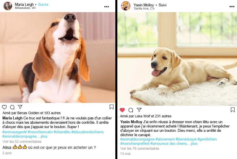 "Mon Golden Retriever de 2 ans est bruyant et tellement têtu. J'ai essayé ce dispositif pour arrêter ses aboiements sur les voitures et les autres chiens par la fenêtre. Elle aime aussi courir après les écureuils, les véhicules et les autres animaux lorsque nous nous promenons. Je suis stupéfaite, cet objet donne des résultats. Ses aboiements et ses poursuites ont cessé presque immédiatement, et je n'ai pas manqué de lui dire "calme" et de la récompenser. Maintenant, elle réagit si bien à ce seul mot. Je ne peux que recommander ce produit si vous avez des problèmes comme moi."